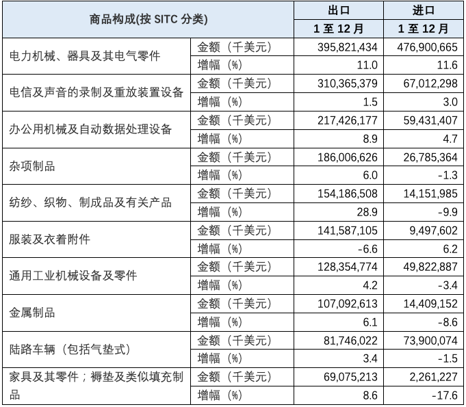 从贸易结构看,中国对欧盟出口产品结构进一步优化,继续从传统劳动密集型产品向高新技术产品延伸,其中,机械和交通设备占比超50%。同时,中国也成为欧盟通用机械、办公设备及电脑、通讯设备、电子设备、船舶、奢侈品等主要出口市场。